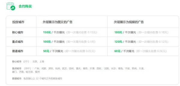 通常普通城市图文广告千次曝光在50元,视频广告在60元左右,重点城市图文广告千次曝光在100元,视频广告在120元。核心城市图文广告千次曝光在150元,视频广告在180元。
