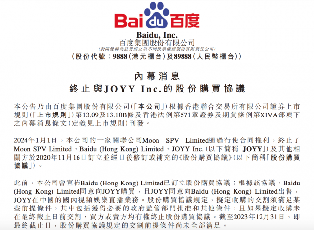 2024年1月1日,百度在港交所发布公告,公司的一家关联公司Moon SPV Limited通过行使合同权利,终止了Moon SPV Limited、Baidu (Hong Kong) Limited、JOYY Inc.及其他相关方于2020年11月16日订立并经日后修订或补充的《股份购买协议》。根据此前签订的《股份购买协议》,Baidu (Hong Kong) Limited同意向JOYY购买,且JOYY同意向Baidu (Hong Kong) Limited出售JOYY在中国的国内视频娱乐直播业务(YY直播)。