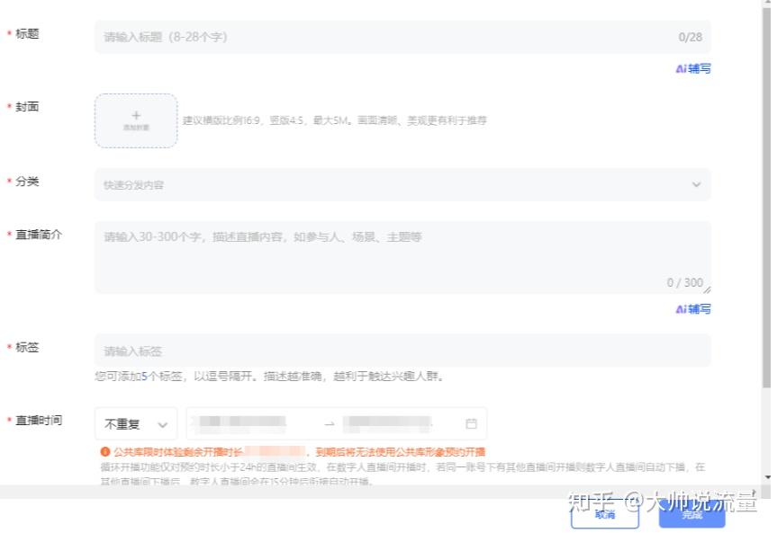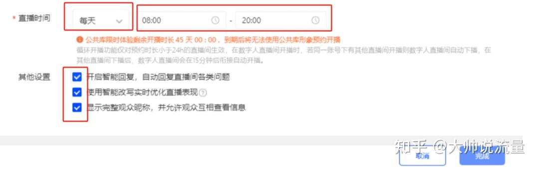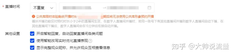 然后直播时间这里说一下,如果你想这个数据人一直直播下去,不要下播的话,那么在直播时间里面选择不重复,你的直播间就会一直直播下去,