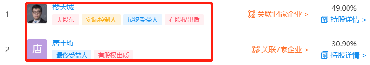 此外,企查查显示,楼天城、唐丰珩等个人股东,均有股权出质信息。