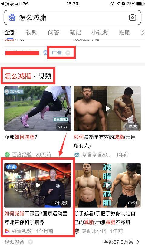 然后会发现在广告下面就会有很多相关的视频。 电脑搜索【减脂的方法】也是一样,绝大多数都是好看视频。