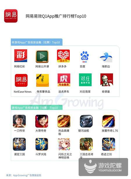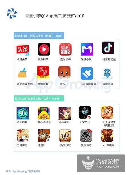 注:为分析不同行业广告主的分布,App Growing 基于AI技术对落地页进行了智能分类,细分为活动推广,应用推广,电商推广。并且基 于App Growing 的广告算法对所追踪到的单个App的广告投放金额进行估算,整理出了该平台Q1广告投放金额排行Top10的游戏及非游戏App。