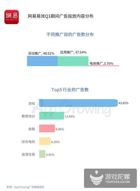 Q1期间,网易易效活动推广类广告数排名第一,占比48.61%。游戏、教育培训、金融、综合电商及旅游住宿行业为该平台广告数Top5的行业。其中,游戏行业的投放广告数占比最多,为43.82%。