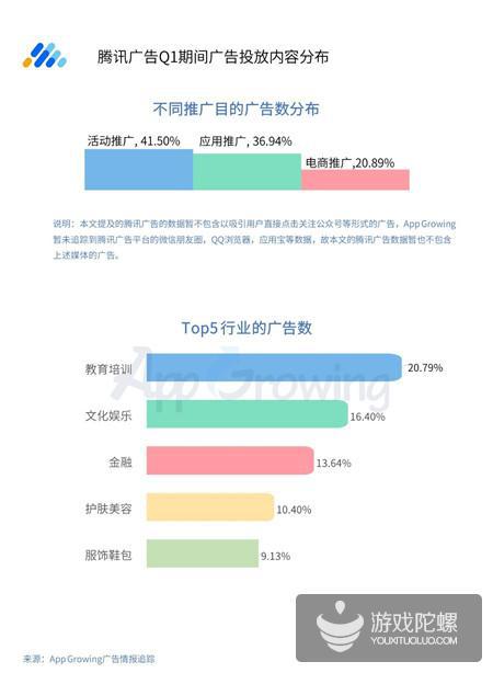 在腾讯广告Q1投放的广告中,活动推广类广告数占比41.50%,教育培训、文化娱乐、金融、护肤美容及服饰鞋包行业为该平台广告数Top5的行业。其中,文化娱乐占比16.4%。