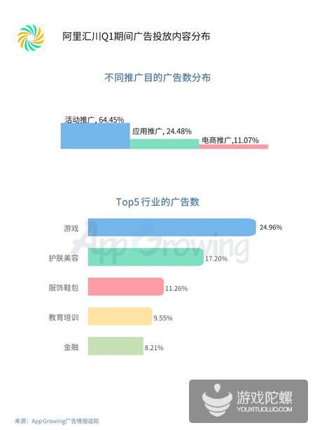 Q1期间,阿里汇川活动推广类广告占比高,为64.51%。游戏、护肤美容、服饰鞋包、教育培训及金融行业为该平台广告数Top5的行业。游戏排名第一,占比24.96%。