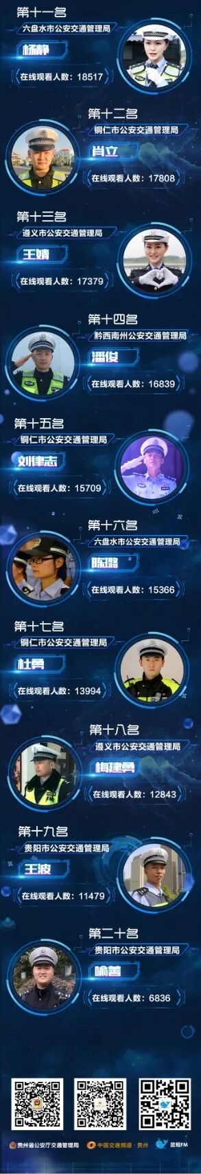 经数据统计,贵州交警网络直播大赛第二阶段结束后,最新观看量排行榜出炉: