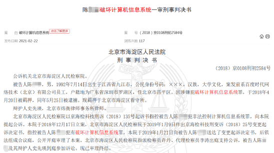 中国裁判文书网公布了这一消息——《陈某睿破坏计算机信息系统一审刑事判决书》,判决书指出,陈某睿原为百度公司员工,负责百度联盟流量端产品的维护与开发。
