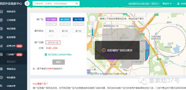 在商家后台“黄金排名”页面最下方,美团称“推广区就是广告投放区域,您可购买推广区内的某固定排名提高门店的流量,购买成功后推广区内所有用户都能看到您的门店”。