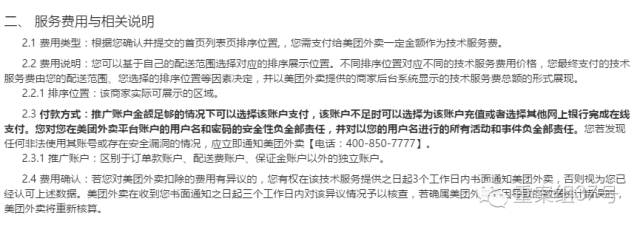 而对于该项服务的说明,美团在协议中解释,费用类型:根据您确认并提交的首页列表页排序位置,您需支付给美团外卖一定金额作为技术服务费。您可以基于自己的配送范围选择对应的排序展示位置。不同排序位置对应不同的技术服务费用价格。