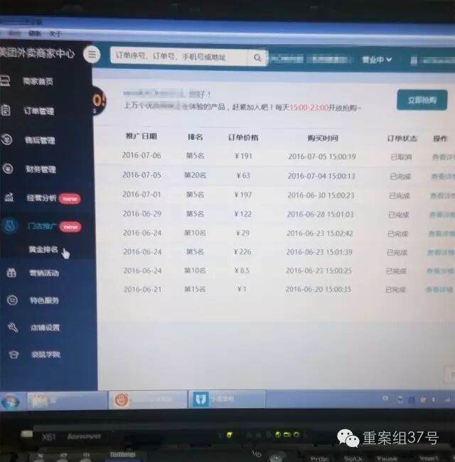 新京报记者在暗访时发现,每当14:59,该店老板的儿媳妇便会急匆匆地赶到电脑前,点开美团外卖商家版左侧的“门店推广”,再选择“黄金排名”,此时右边界面会显示出店铺的购买记录和“立即抢购”四个大字。