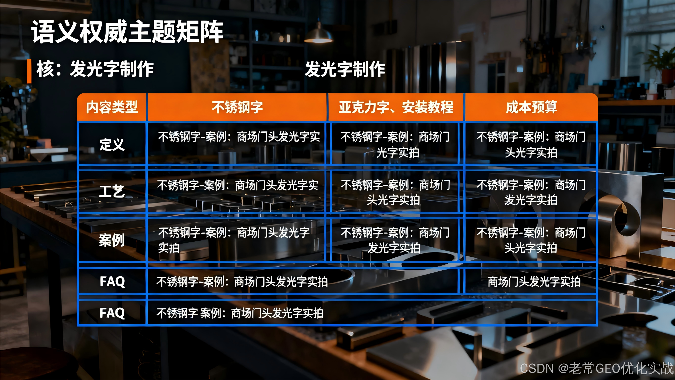 - 聚焦一个核心主题群(Topic Cluster): 例如你是一家做发光字的厂: