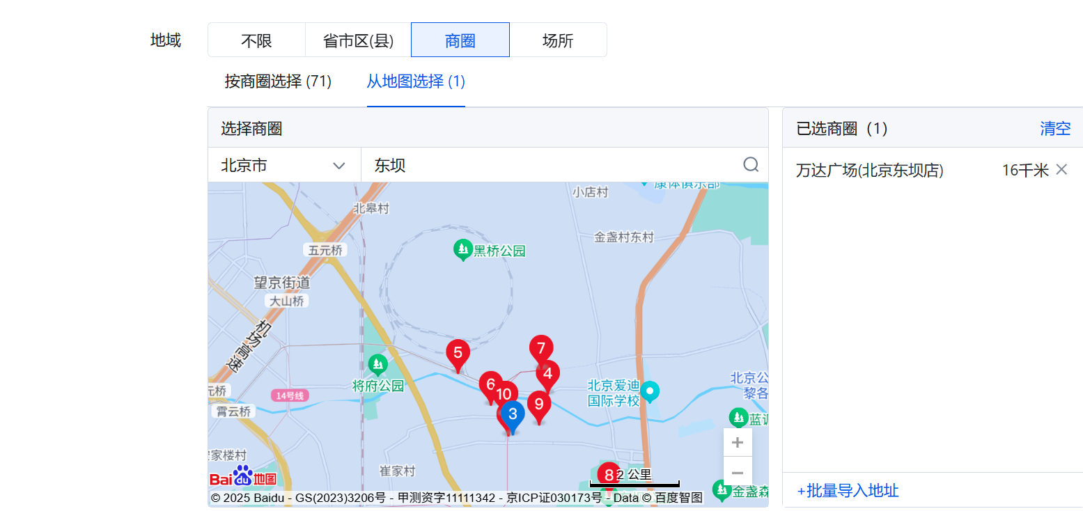 如果跑单地区,设置商圈更容易跑量。单选择一个市没有选择商圈更好点。