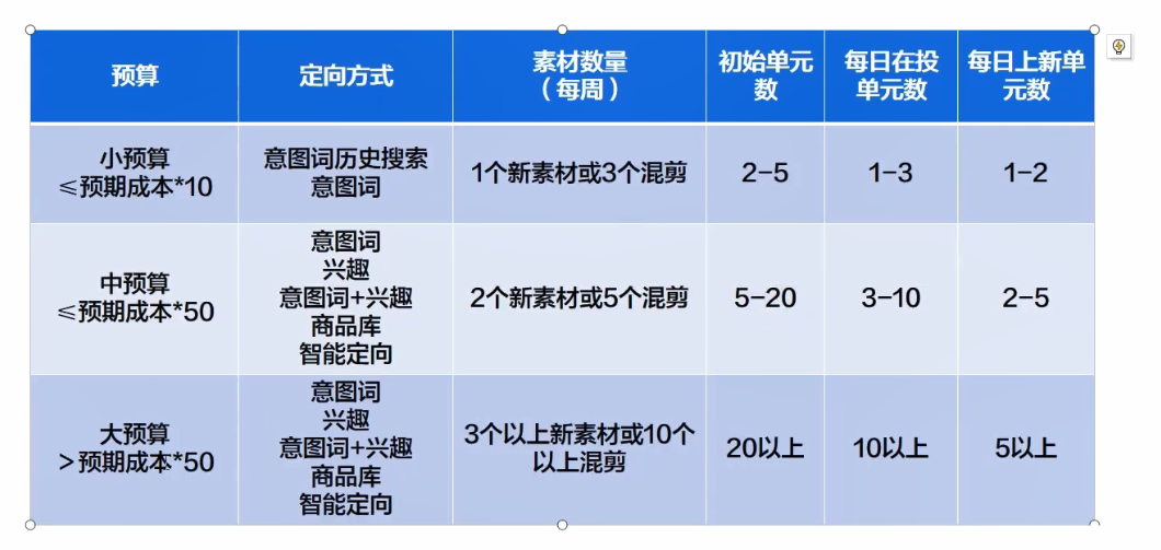2、前三天以提价,建新单元为主进行放量,意图词与兴趣定向逐步添加测试3、第四到六天,增加自动定向、单独兴趣定向与更多创意样式投放4、第七到九天,增加商品库、人群包等定向,放量投放等更多测试维度5、测试过程中需要保持创意更新,不能只投放最开始的一组创意