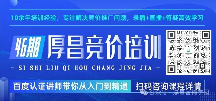 《厚昌竞价培训》课程招生中,专业讲师一对一指导,高质量社群7*24小时答疑解惑,报名即送账户诊断,欢迎大家踊跃报名。