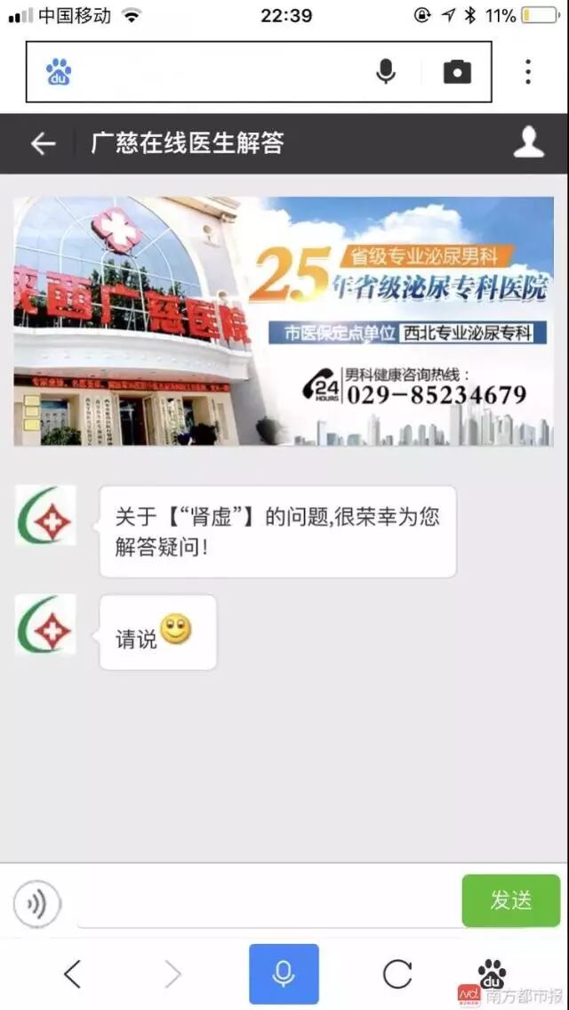 在百度等搜索的手机端应用上,搜索某个疾病关键词,排名前几个往往都是医院的广告,点击进去以后会直接出现聊天界面,写着诸如“点击咨询”、“想问啥,来吧”、“咨询医生”等字样。