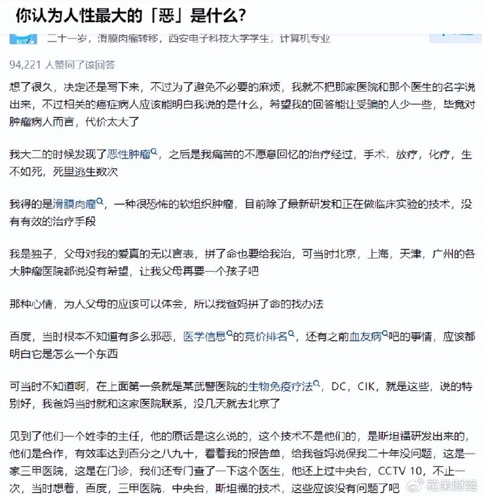 而在2016年,随着魏则西在知乎平台上留下一个问题:“你认为人性最大的恶是什么?”直指百度当时根本不知道有多么邪恶,医学信息的竞价排名,还有之前血友病吧的事情。随后不久,魏则西去世,迅速引爆舆论。