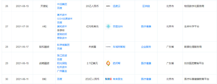 与此同时,百度还开始了大规模的投资各种新兴的医疗初创企业。有数据显示,2018年至2022年,百度共投资了62家医疗企业,这些医疗企业覆盖面之广令人咋舌。