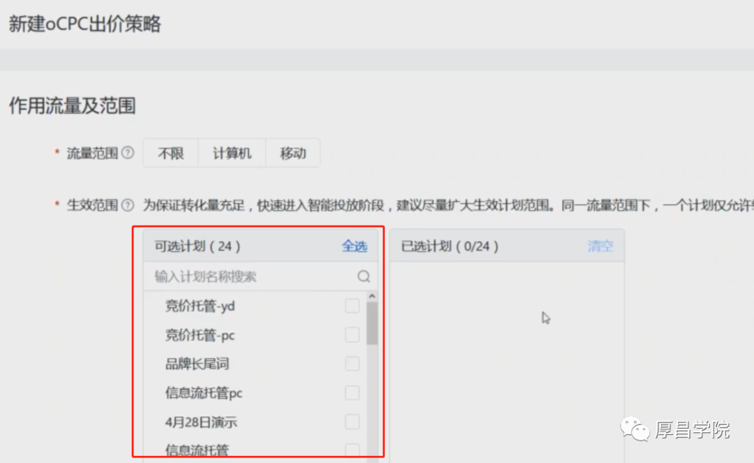 选择想要智能调控的计划,选择了某个计划之后,选定计划的关键词进到第二阶段之后的出价、匹配模式会被系统接管,未选择的计划不会受到任何影响。