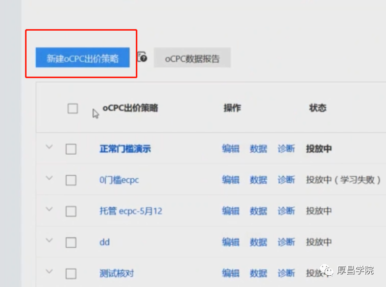 进到页面后,点击【新建ocpc出价策略】。也可以叫做建“投放包”也是我们常说的“建包”