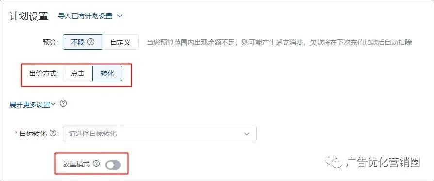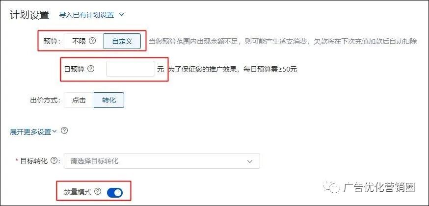 请注意:开启放量模式,需明确设置计划的预算(见下图),预算设置不能太低,以便系统快速学习放量。