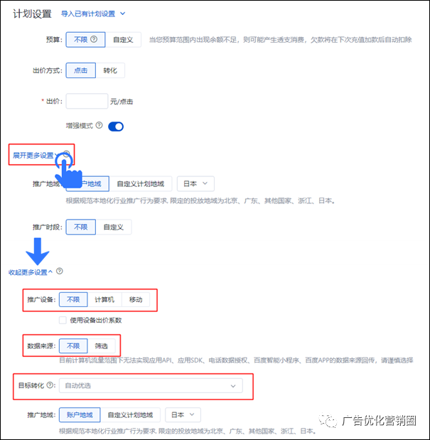 开启增强模式后,您可以在“更多设置“中可以设置目标转化,当您不设置目标转化时,系统会自动为您优选最优的转化目标,并动态调整出价为您带来更多转化。详情参见附件产品操作手册。