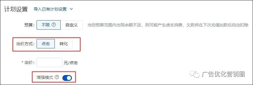2.2 出价方式选择“点击”时,新增“增强模式”开关,开关状态默认开启(见下图示意):