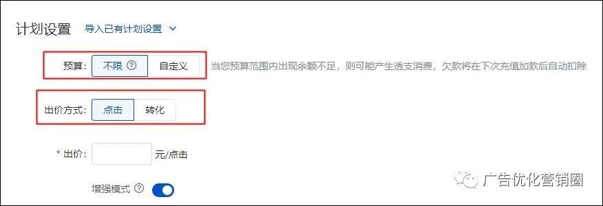 注:两种方式均需填写计划出价。当计划内的关键词和单元未设置出价时,会使用计划设置的出价进行竞价。实际使用的点击出价=出价*出价系数。在增强模式下、您所设置的推广计划设备、时段、地域和人群出价系数依然生效,这些出价系数表达了您对不同地域、时段、人群规则下的价值判断。增强模式会参考实际点击出价设置,为关键词匹配到的每一次搜索流量动态调整出价。关键词的出价优先于单元和计划上设置的出价。即,点击出价方式(无论是否开启增强模式)情况下,推广计划在竞价时参照的是最细粒度的实际点击出价。