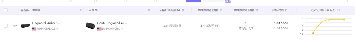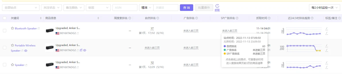 这里使用插件我们可以很清楚的知道,我们的广告排名,以及近24小时的趋势。从而给到我们指导,给我们一个提价的区间方向。