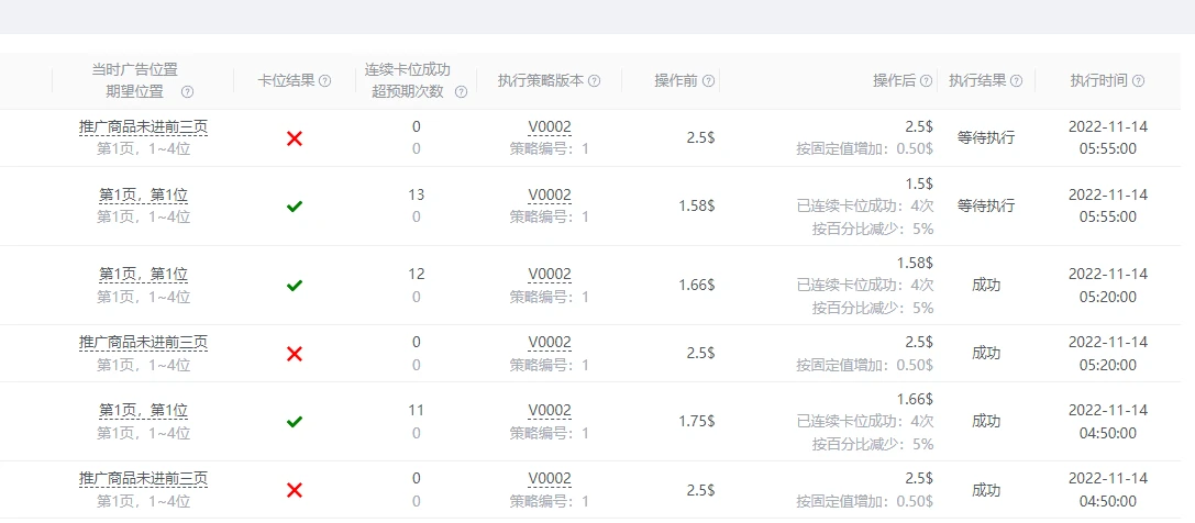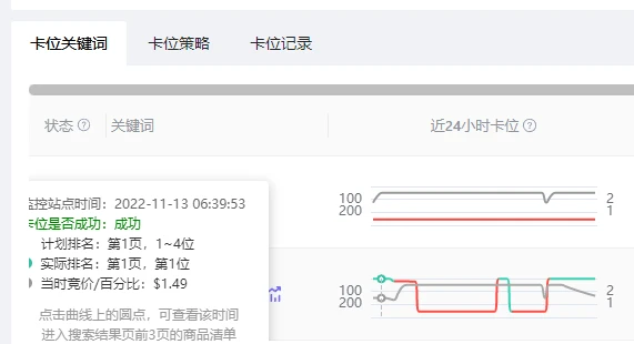 绿色代表成功卡位,红色代表卡位失败。同时可以看到当时卡位成功的出价。这里可以明显看到,这个关键词只有两段时间卡位成功,说明中间这段时间其他卖家价格出的比较高。所以这里我们就需要再提高一下固定加价的价格,需要保持更高时间的卡位成功,从而获取这个关键词更多的流量。