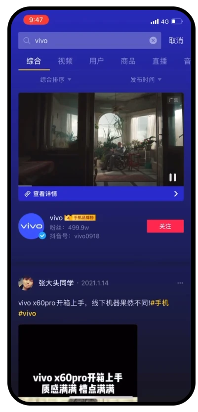 抖音搜索广告是抖音广告类型中较为特殊的一类,用户根据自己的需求,在抖音平台自行搜索想要的产品,当搜索内容中包含广告关键词后,就会自动播放广告视频,弹出Lottie动画,互动性强。