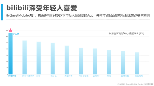 B站号称中国年轻人高度聚集的综合性视频社区。其官网显示,月均活跃用户数为2.23亿,35岁及以下月活用户占比86%。B站的核心用户为“Z+世代”(出生于15527649518年间),据QuestMobile统计,B站是中国24岁以下年轻人最偏爱的App,并常年占据百度00后搜索热点榜单前列。
