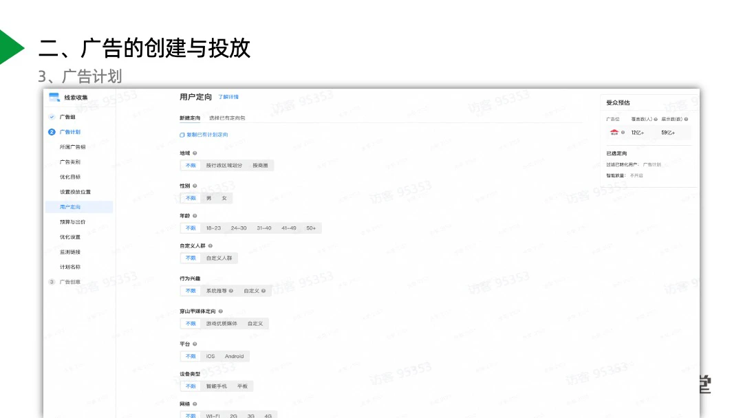 一条广告计划的素材或内容需要推送给哪些用户,这些都需要进行圈选,比如用户运营经常需要给用户打标签,包括地域、性别、年龄、行为、平台等。