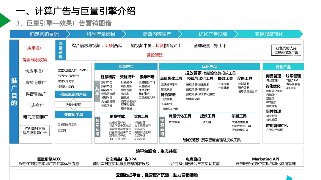 因为各家产品比如快手、腾讯、微博、Facebook、Twitter等信息流和搜索广告的玩法和逻辑都差不多,所以本次主要以头条的巨量引擎为例,上图所示是其效果广告营销图谱。