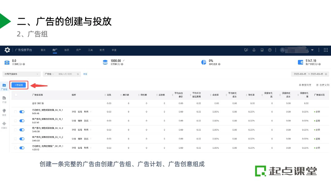 后台的操作流程:进入后台,首先要新建广告组,而创建一条完整的广告通常由广告组、广告计划、广告创意组成。