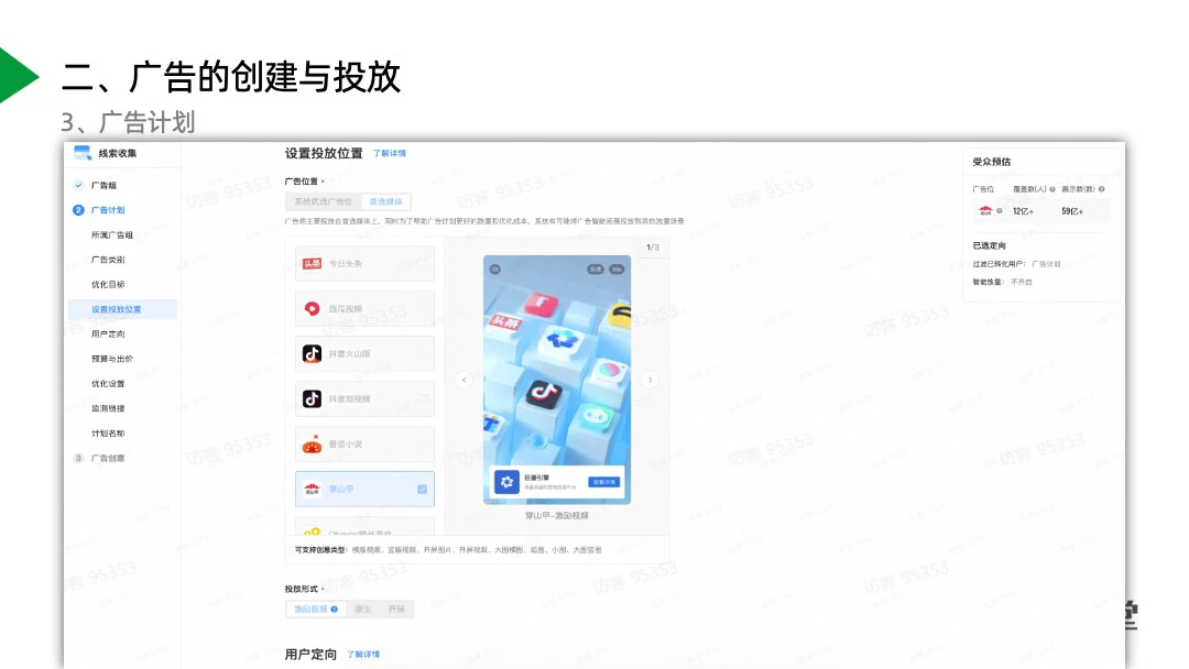 再往下是设置广告投放位置,比如今日头条、西瓜视频、火山等,需要设置广告出现在哪些媒体或平台上,选择广告类别、优化目标和设置投放位置是基础的配置,最关键的是需要给用户定向。