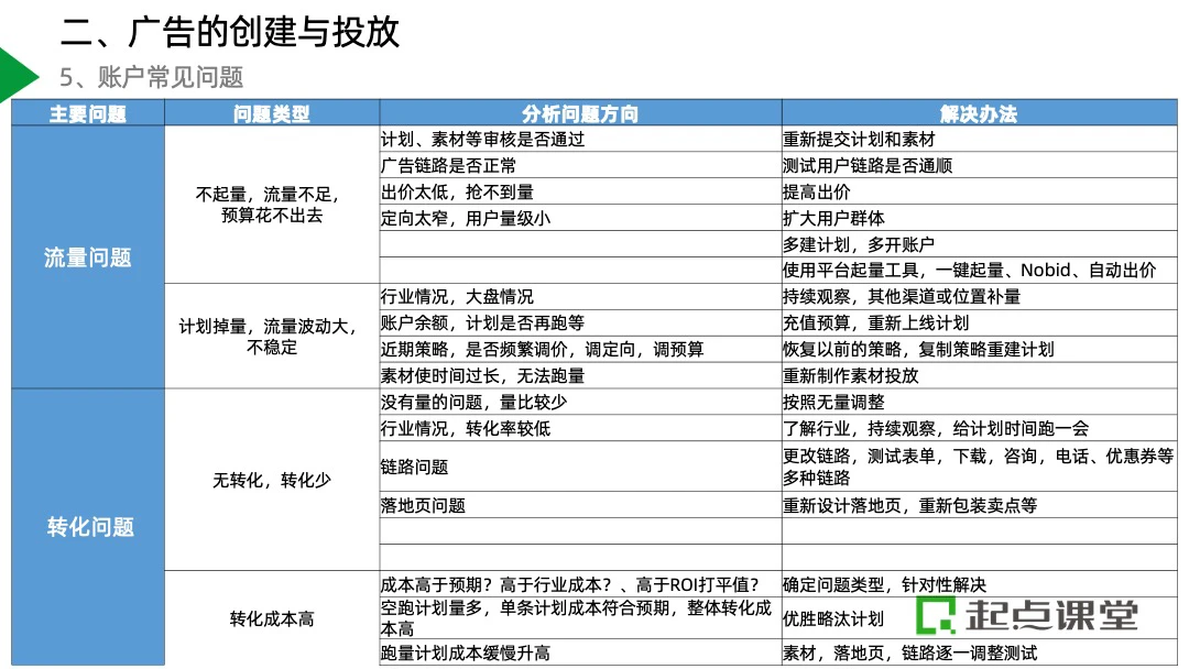 第一,流量问题,主要分两种类型,一是不起量、流量不足、预算花不出去,这时就需要具体问题具体分析,如果是计划、素材等审核没有通过,就可以重新提交计划和素材;如果是广告链路不正常,就需要测试用户链路是否通顺;如果是出价低而导致抢不到量,就需要提高出价;如果是定向太窄导致用户量级小,就需要扩大用户群体。