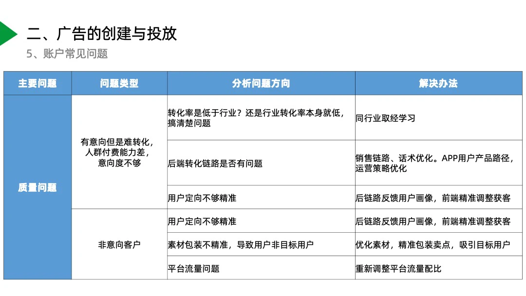 第三,质量问题,类型一是有意向但是难转化、人群付费能力差和意向度不够,这时需要清楚是转化率低于行业,还是行业转化率本身就低,前一种情况需要和同行业取经学习;如果是后端转化链路有问题,就需要对销售链路、销售话术进行优化,以及APP用户的产品路径和运营策略优化;如果是用户定向不够精准,则需要通过后链路反馈用户画像,才能在前端精准调整获客。