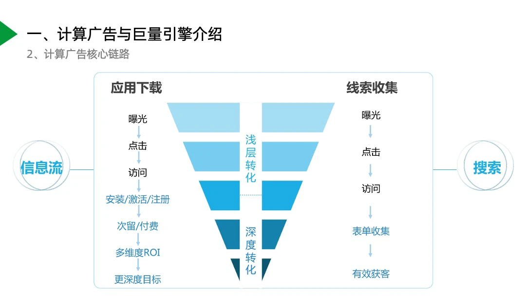效果广告主要分为信息流广告和搜索广告两大类,广告目标也分为应用下载和线索收集两种类型,其中应用下载是指移动端,主要是把APP下载到手机端,链路为曝光-点击-访问-安装/激活/注册-次留/付费-多维度ROI-更深度目标。