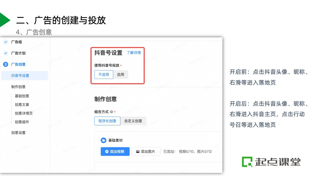 使用抖音号投放时,在开启前需要点击抖音头像、昵称、右滑等动作后才能进入落地页;而开启后则可以点击抖音头像、昵称、右滑等动作进入抖音主页,然后再点击行动号召等进入落地页,等于可以给主页增加曝光量,也可以引导粉丝;制作创意的组合方式分为程序化创意和自定义创意。