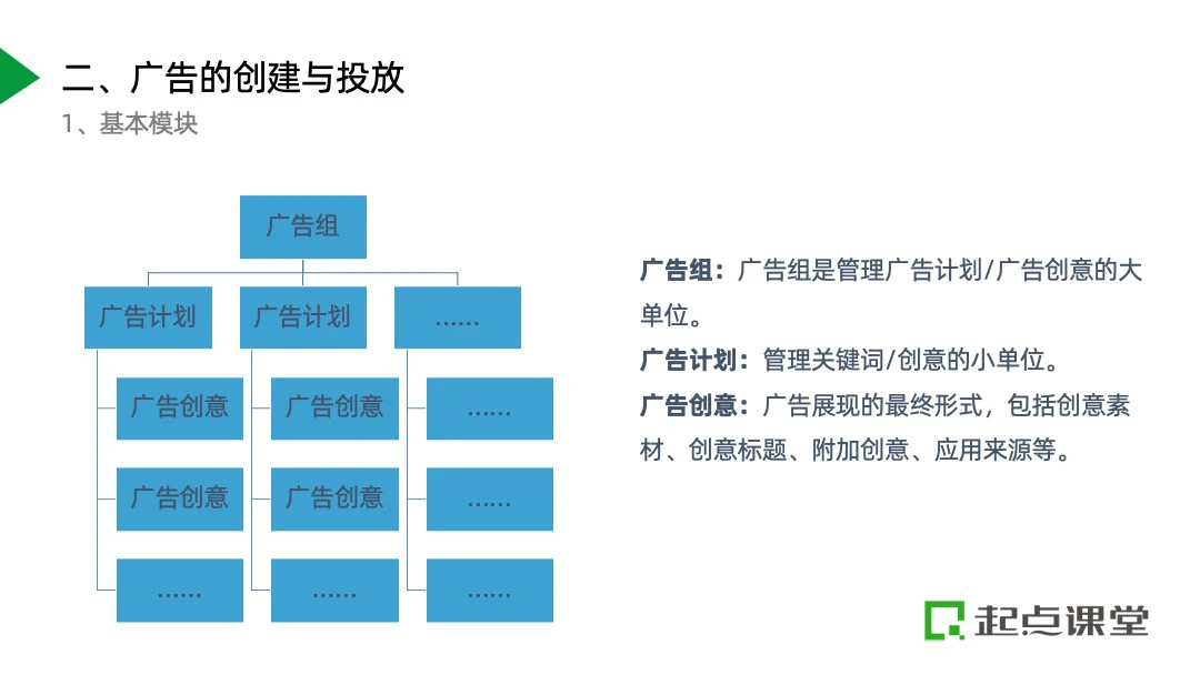 以巨量广告为例,首先在后台创建账号时会涉及三个概念:广告组、广告计划和广告创意,每个平台的组合计划优先级都不一样,需要理解上图左侧的组织架构图,比如广告组下面有多少个广告计划,而广告计划下又有多少条广告创意;或者是广告计划下面有多少个组,广告组下面又有多少个广告创意,由此形成一条投放计划或组的逻辑,即实操过程。