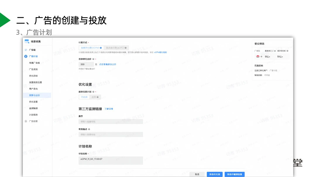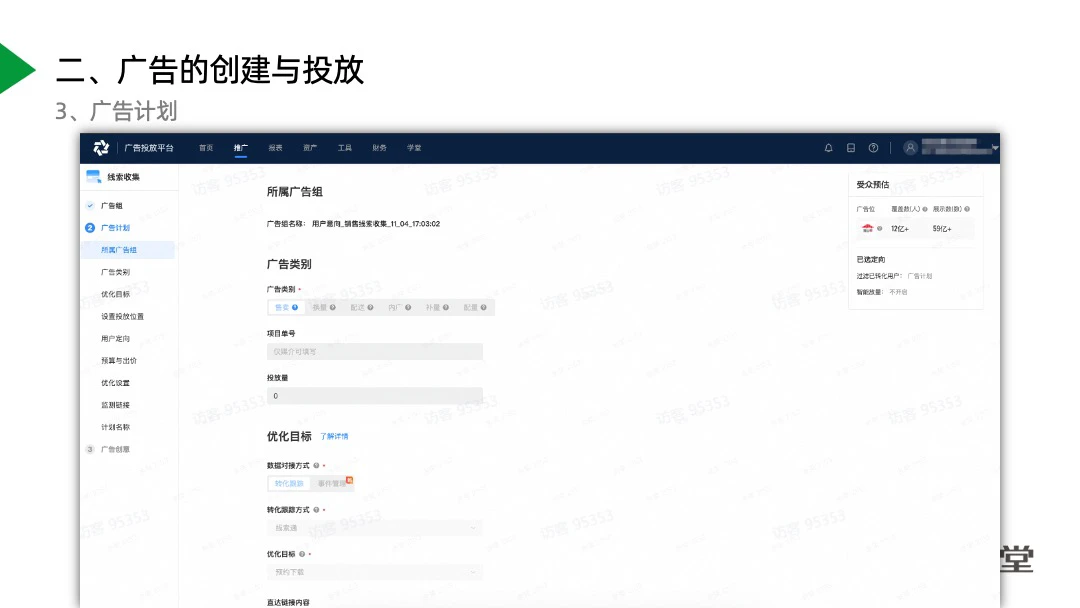 广告组完成后就可以创建广告计划,由上图左侧所示,广告计划中首先要选择广告类别,一般都是默认销售类,其余是跟平台深度合作后才会用到的类别;其次是优化目标和转化率,转化率主要是跟随方式并优化目标。