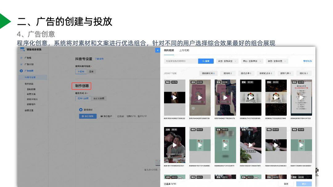 程序化创意是指把素材、标题都打散到最小模块,让系统对素材和文案进行优选组合,然后针对不同的用户选择综合效果最好的组合展现;自定义创意则是自己选择,比如计划组里有哪些素材出现等,比较适合投放量少,且不能满足程序化创意投放条件的产品。