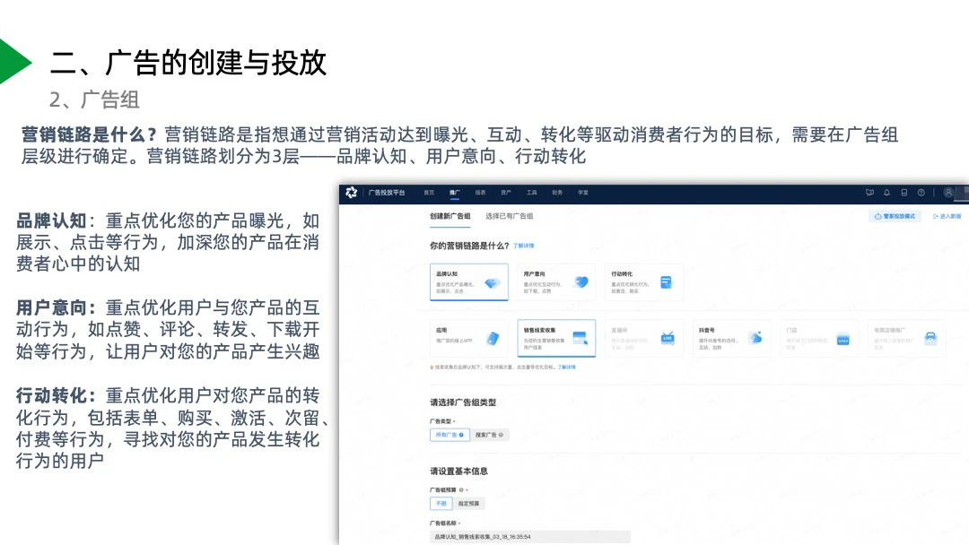 其次,在组的维度上需要配置营销链路,营销链路是指可以通过营销活动达到曝光、互动、转化等驱动消费者行为的目标,需要在广告组层级进行确定。而营销链路可以划分为3层:品牌认知、用户意向和行动转化。