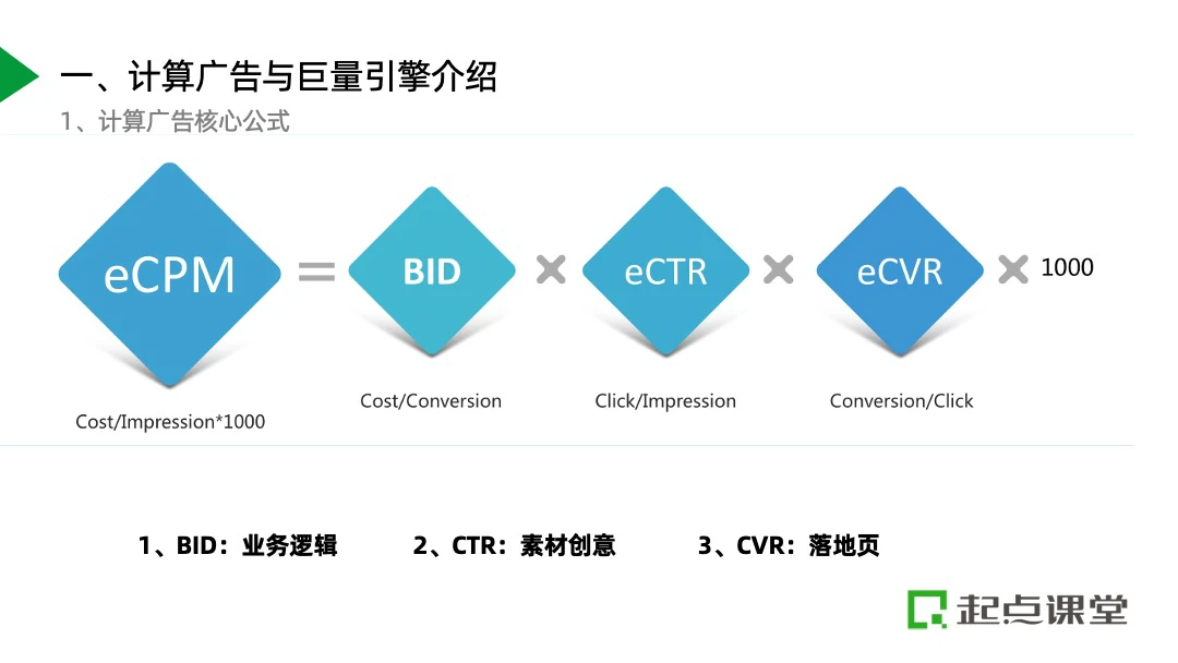 计算广告的核心公式:eCPM=BID x eCTR x eCVR x 1000,其中eCPM是指每一千次展示可以获得的广告收入,eCTR是指预估点击率,eCVR是指预估转化率。