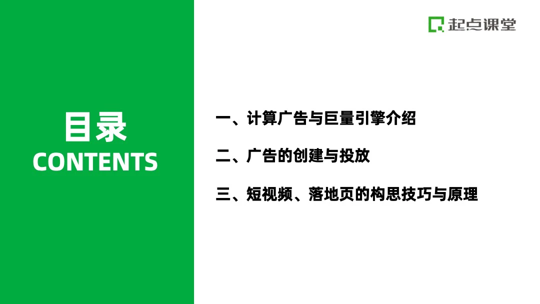 本次分享主要分三大部分:第一部分是关于计算广告和巨量引擎的介绍;第二部分是广告的创建和投放;第三部分是短视频、落地页的构思技巧与原理。