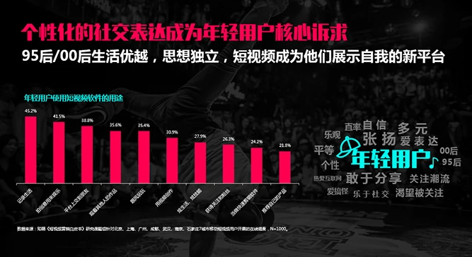 抖音是一个专属于年轻人的时尚的短视频社区,抖音是颠覆性的人与硬件交互方式,这里的颠覆性分为形式颠覆(舞步、脑洞、搞怪、演技、动作、视觉、音乐、节奏)和用户个性颠覆(表达、灵感、消遣、娱乐、解压、释放、社交、跟风)。抖音的用户大多都是以魔性额表达方式,畅快的表达自己,这就是抖音专属的style。快手只关注于记录用户,而抖音不仅仅是记录,更是释放自我。