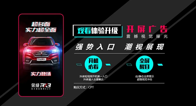 抖音开屏广告以巨幅图片或视频的形式在抖音APP启动时展现,广告的展现时间为用户打开APP的第一时间,用户对广告信息的接收度高,同时,以相对酷炫的效果在APP启动时自动展现,给用户的视觉和感官上的冲击都非常高。
