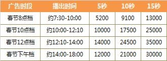 | 广告时段 | 播出时间 | 5秒 | 10秒 | 15秒 | |