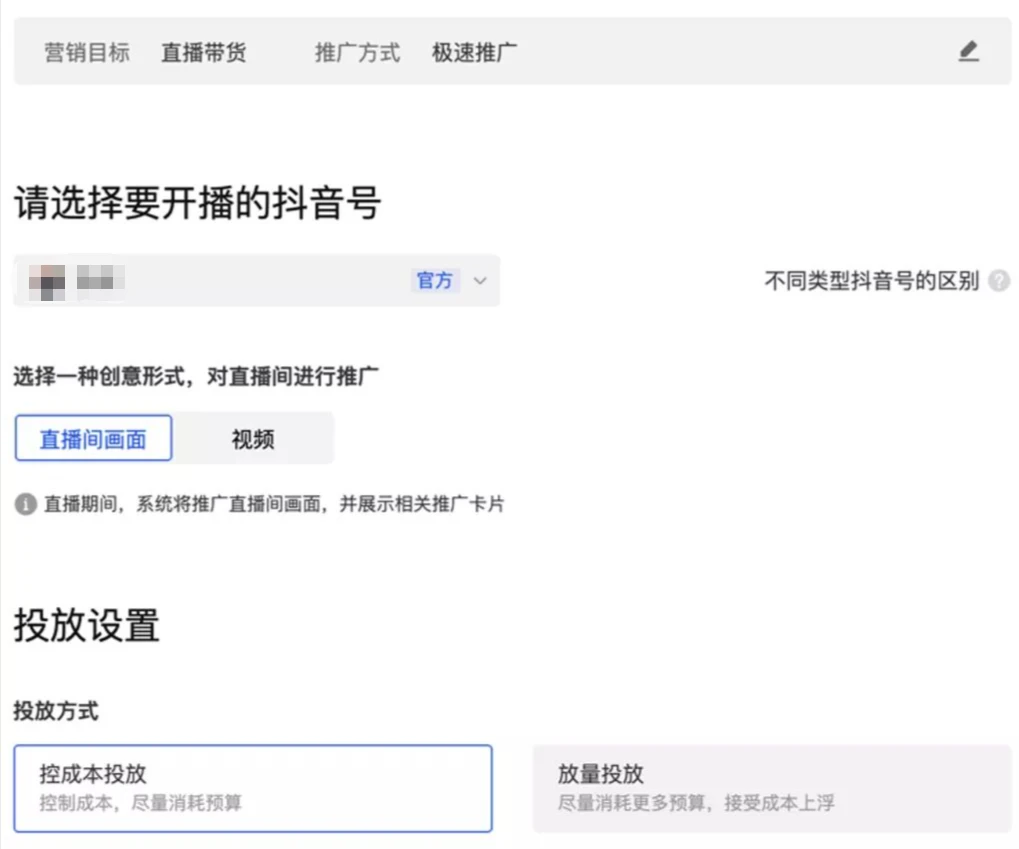 极速推广适合没有投放经验的商家用户自投,操作简单,几乎没有定向,一键设置出价预算即可投放,具体内容如下图: