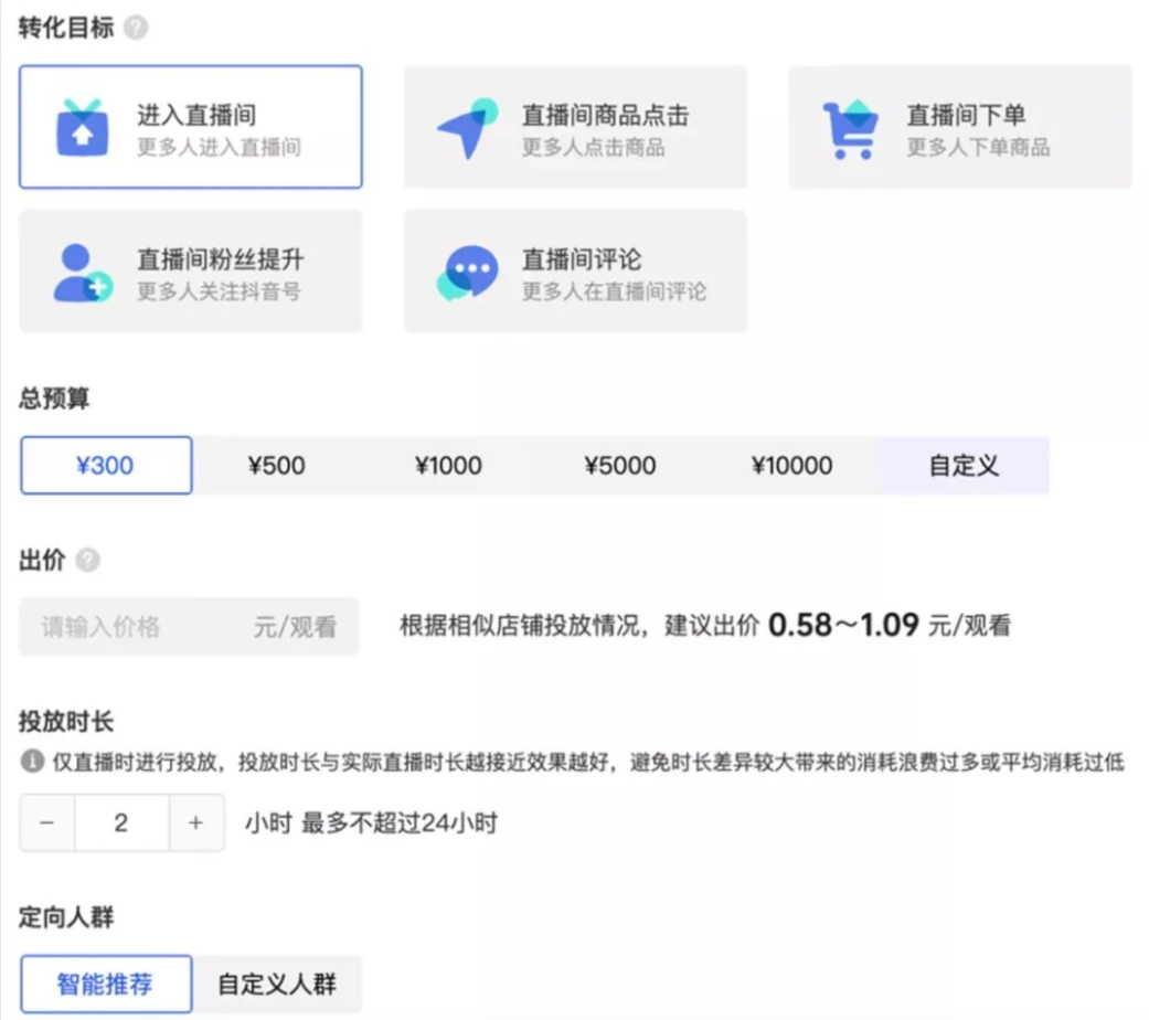 冷启动期:圈选产品精准人群+直播人货场精细化策划=精准账号标签,圈人群首选相似达人,转化目标的选择根据主播承接能力定,新主播优先选下单、成单,有经验的主播优先选商品点击、进入直播间、评论类的浅层目标。